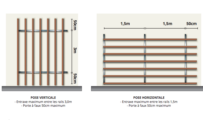 POSE HORIZONTALE - Entraxe maximum entre les rails 1,5m - Porte à faux 50cm maximum