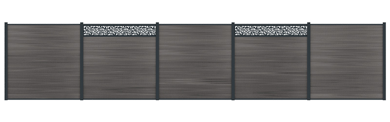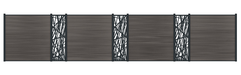 Ce décor est résolument contemporain et apporte un style unique. Les décors sont proposés avec leur cadre en aluminium rainuré qui s'assemble parfaitement sur les lames aluminium ou composite et dans les feuillures des poteaux.